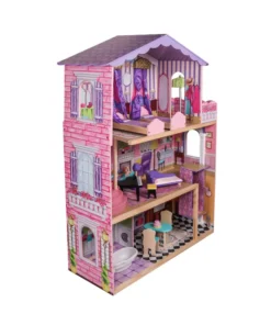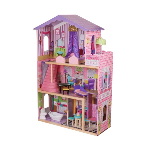 בית בובות ענק עם שלוש קומות, מעלית, מרפסת וריהוט מלא – חוויית דמיון מושלמת לילדים.