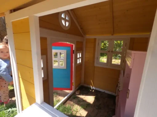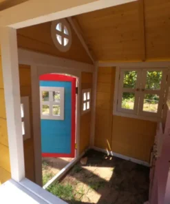 בית משחק מעץ לחצר בצבעי אדמה ותכלת – עמיד לגשם, מתאים לפעילות דמיון ומשחק חיצוני.