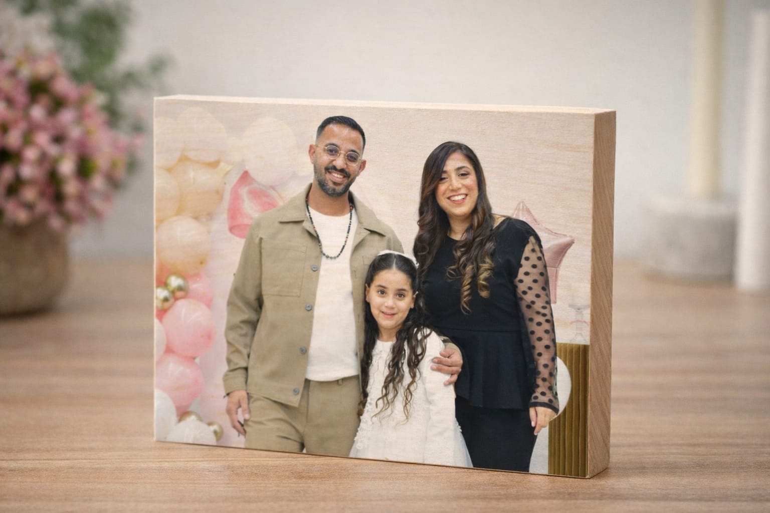 בלוק עץ איכותי בגודל 20×15 ס״מ, המשלב מראה טבעי וחמים עם הדפסה אישית מרגשת.