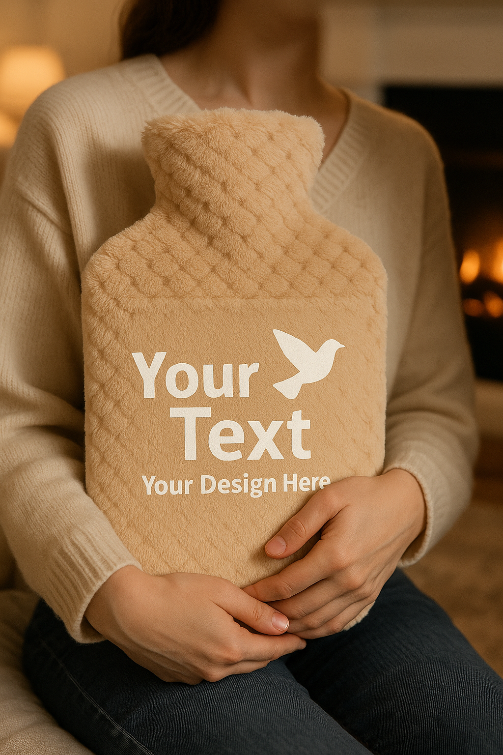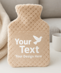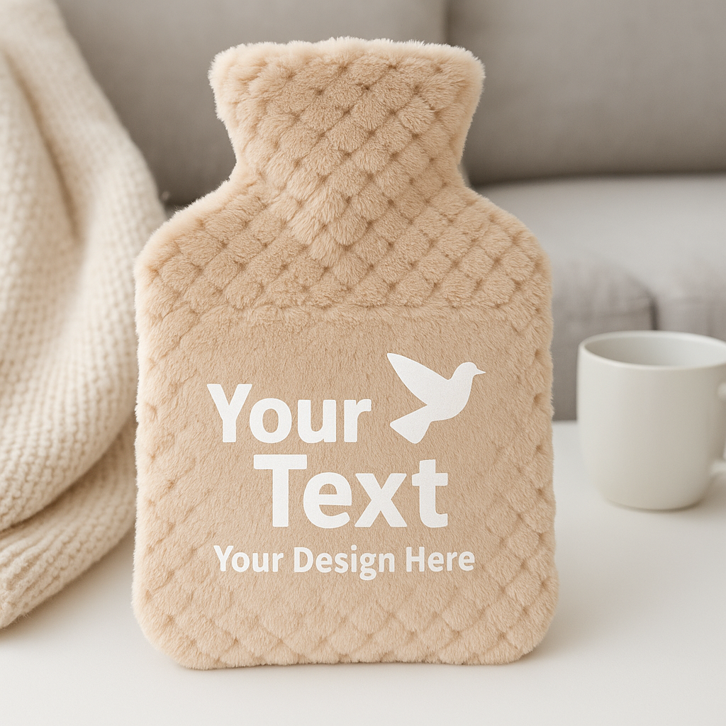 בקבוק חימום איכותי עם כיסוי פרוותי רך במיוחד – עכשיו עם הדפסה אישית לבחירתכם!