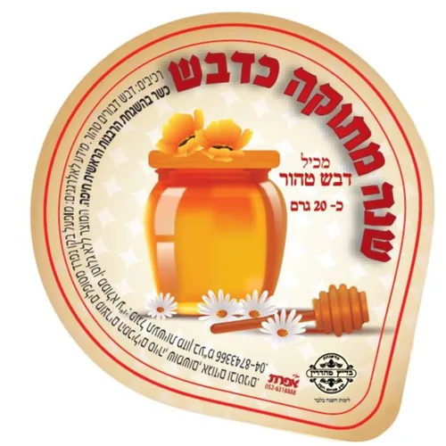 דבש 20 גרם אישי וממותג לסימני ראש השנה עם כיתוב "שנה מתוקה כדבש". מתאים לגנים