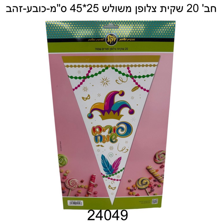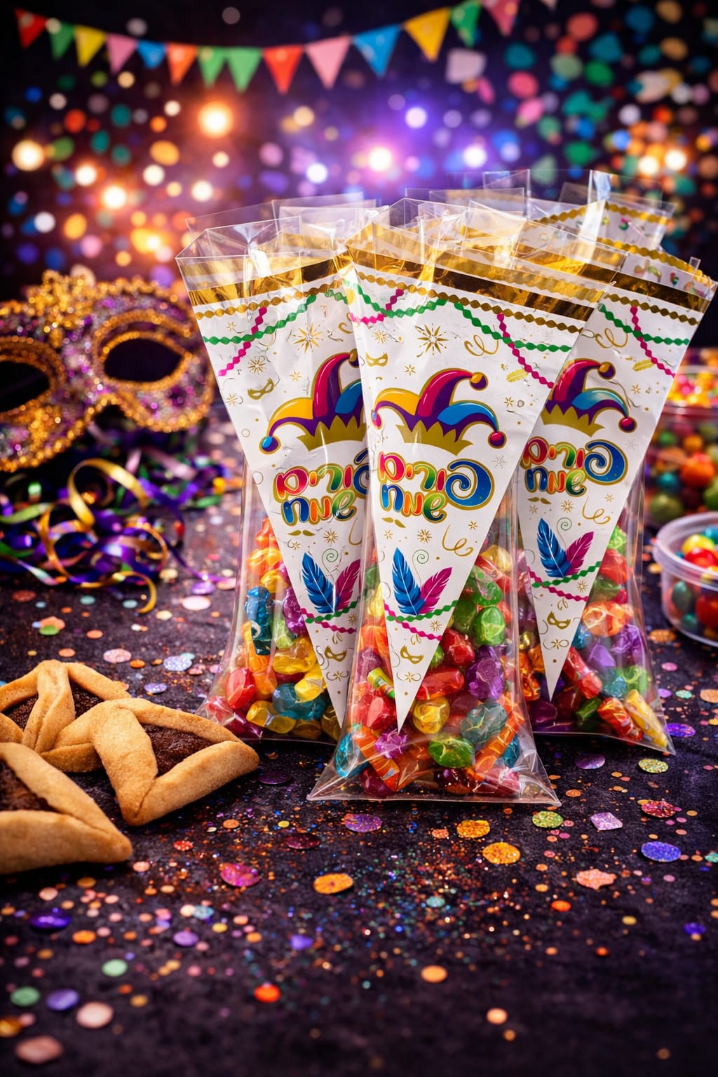 חבילת 20 שקיות צלופן משולשות לפורים בעיצוב חגיגי ושמח, מושלם לאריזת משלוחי מנות, מתנות לילדים, ממתקים והפתעות חג.
