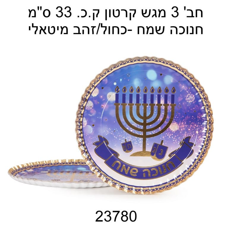 חב' 3 מגש קרטון ק.כ. 33 ס"מ -חנוכה שמח – כחול/זהב מיטאלי