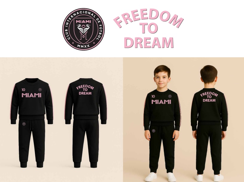 חליפת כדורגל פוטר לילדים בעיצוב Miami – מיאמי עם מראה ספורטיבי בולט ונוכחות של כוכב.