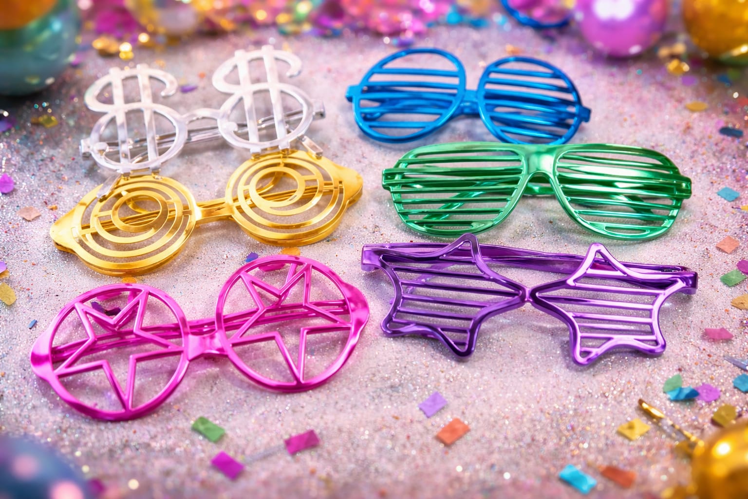 המשקפיים מגיעים במגוון צורות מקוריות – פסים, כוכבים, ספירלות, סימן דולר ועוד – ובצבעים בולטים ושמחים שמצטלמים נהדר.