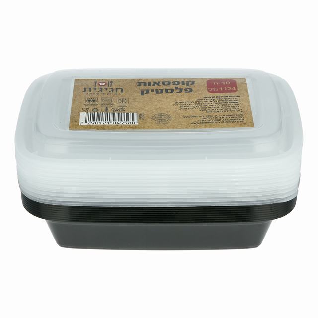 מארז איכותי של 10 קופסאות פלסטיק מרובעות בנפח 1124 מ״ל עם מכסים תואמים ואטומים. מושלם לאחסון מזון, הכנת אוכל מראש, קייטרינג ואירוח – נוח, פרקטי ושומר על טריות.