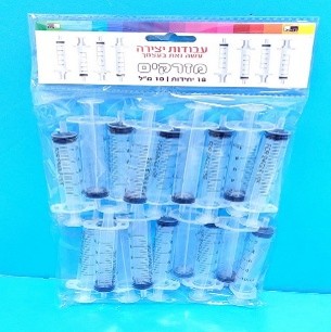 כל מזרק עשוי פלסטיק עבה ועמיד, נוח לשימוש, ומאפשר שליטה מדויקת בכמות הנוזל או הצבע.