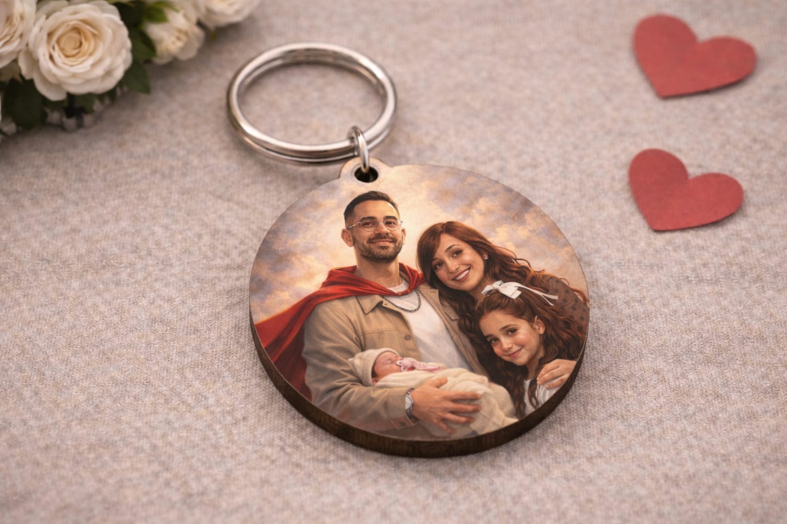 מחזיק מפתחות מעוצב בצורת עיגול , עשוי עץ טבעי איכותי, עם ציפוי מיוחד להדפסת סובלימציה – מושלם להנצחת רגעים מרגשים ולהפיכת כל תמונה למזכרת יומיומית עם ערך רגשי.
