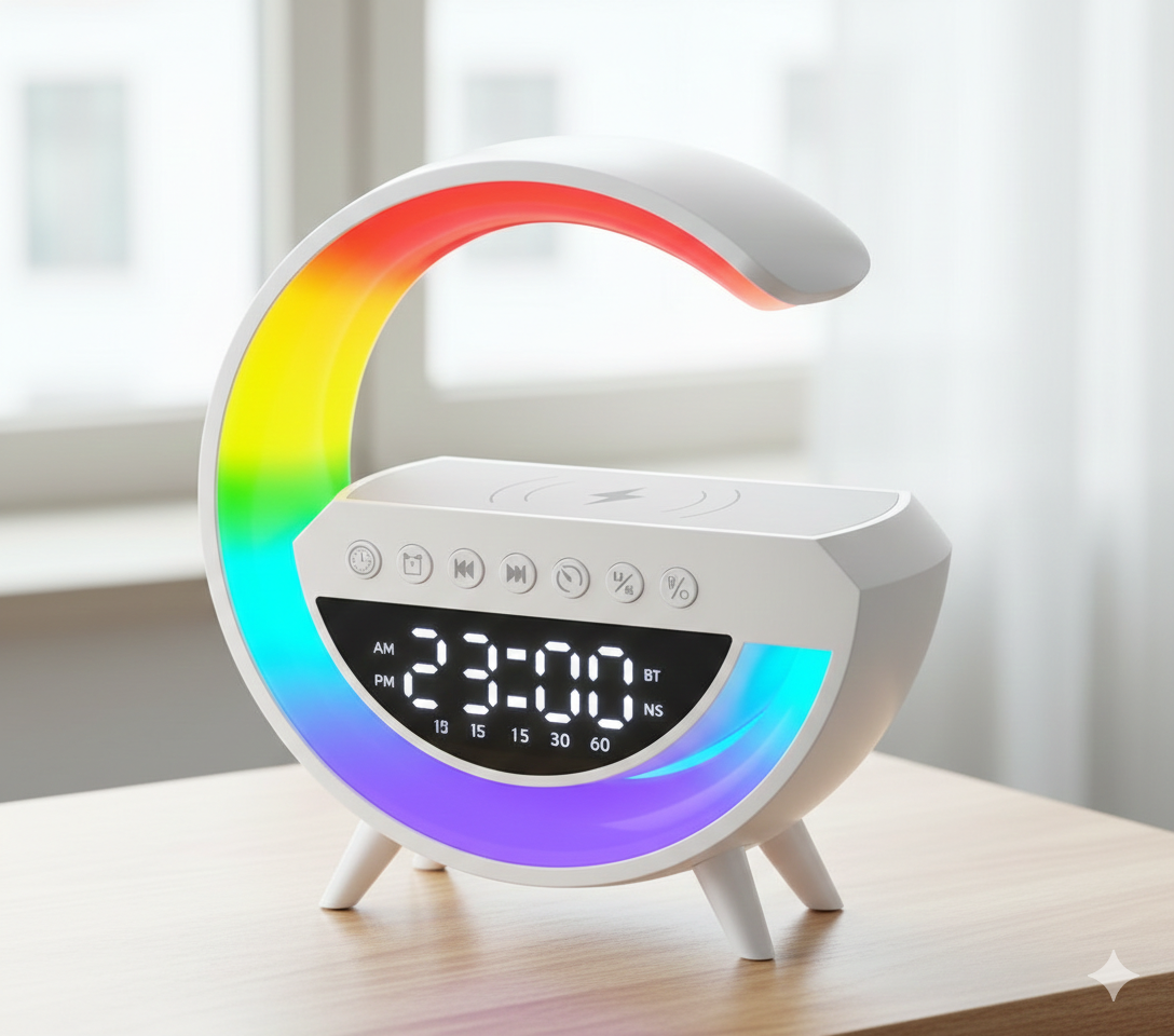 רמקול Bluetooth חכם עם משטח טעינה אלחוטית 15W, תאורת LED מחליפת צבעים, רדיו FM ושעון מעורר דיגיטלי – פתרון מושלם לשולחן או לשידה.