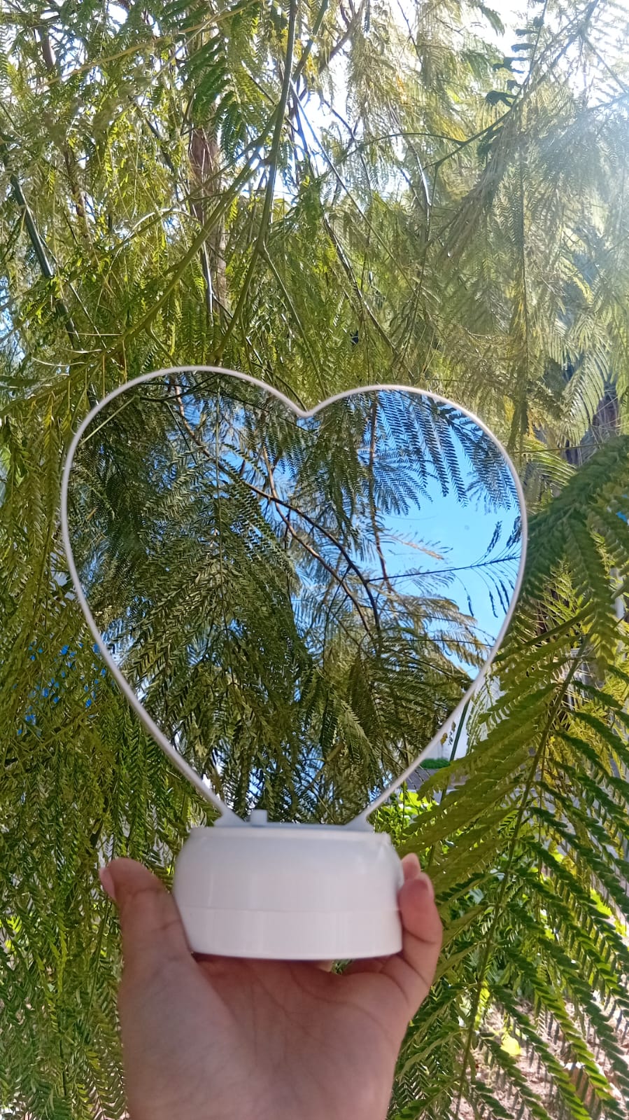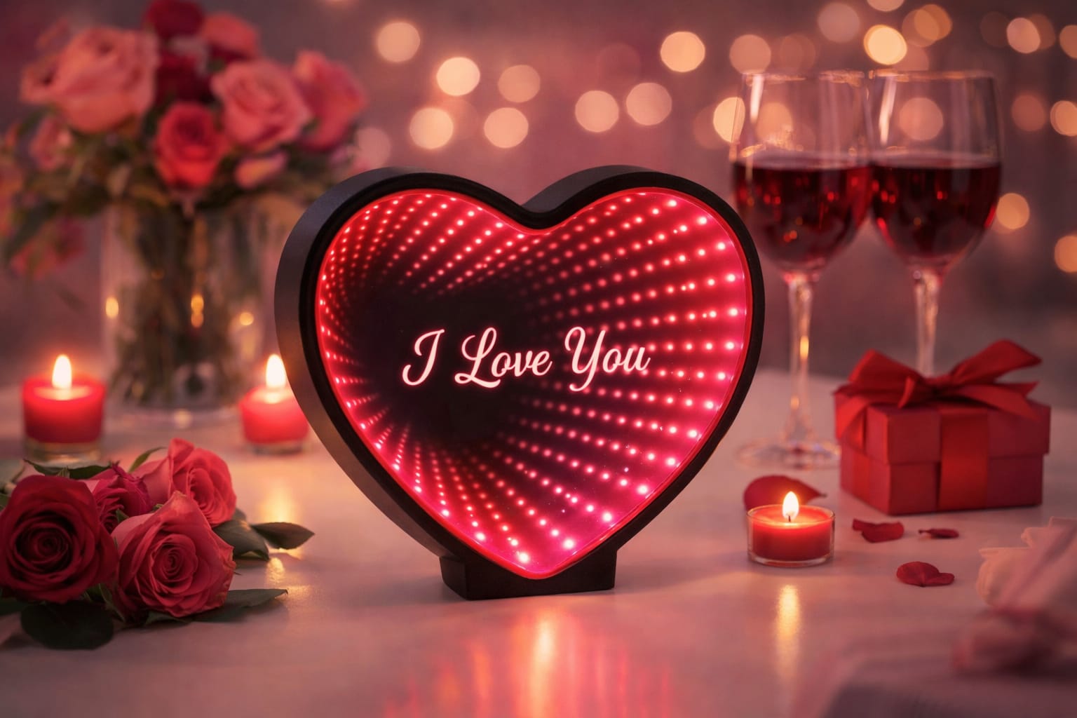 מראת קסם בצורת לב עם תאורת LED חכמה היוצרת אפקט אינסוף עוצר נשימה.