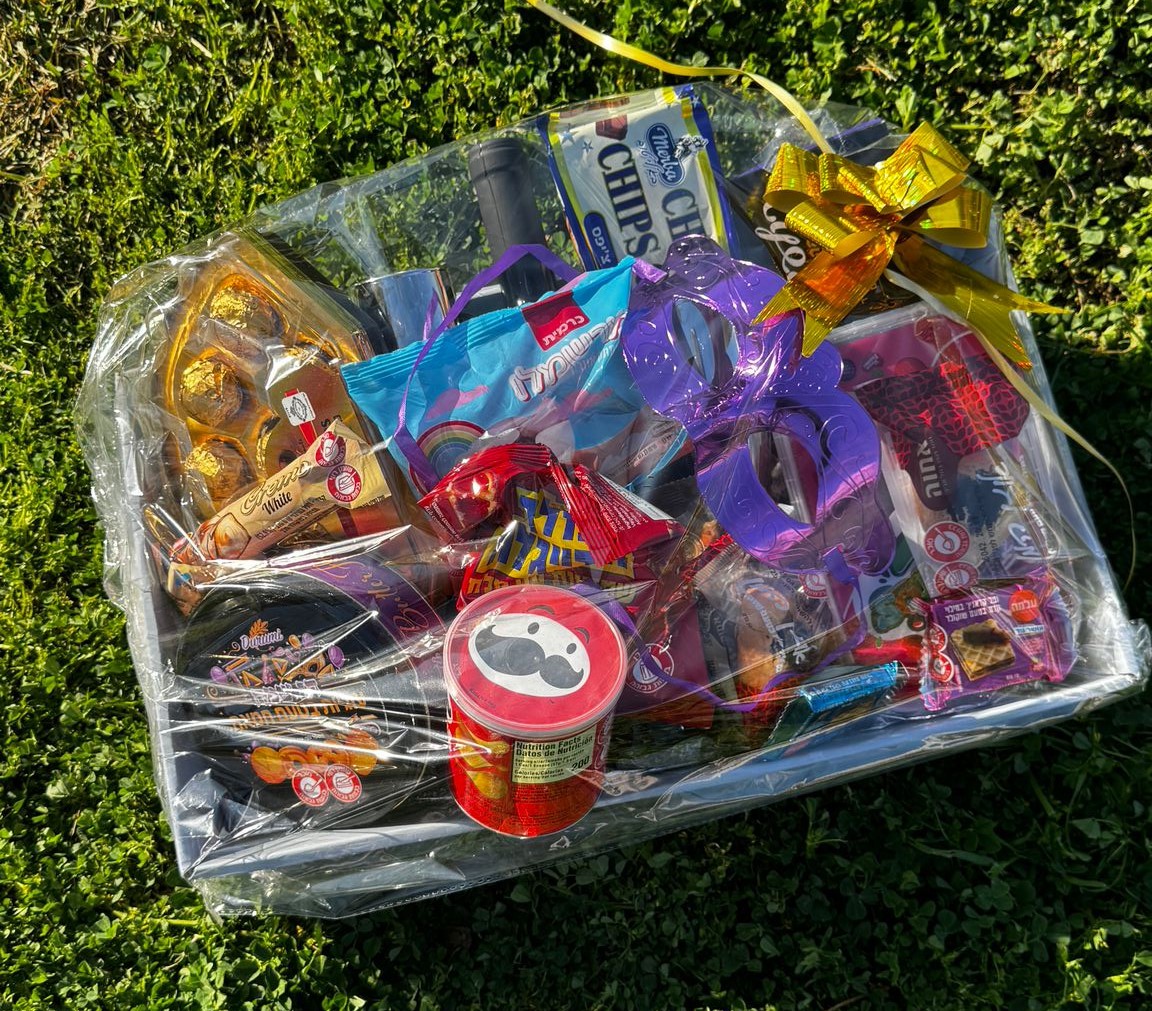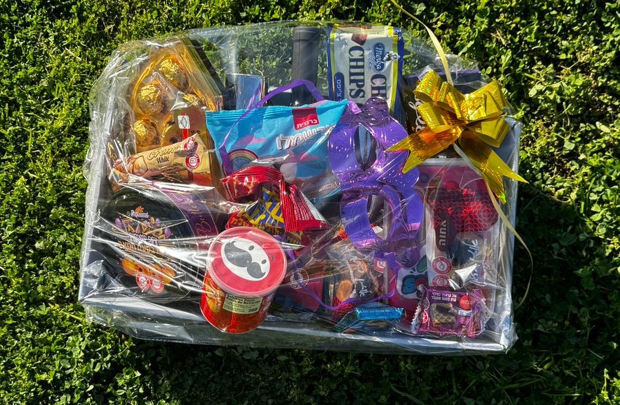 המשלוח מנות מכיל: ממתקים, יין וכוסות, דמי כיס, מסיכה, רעשן.