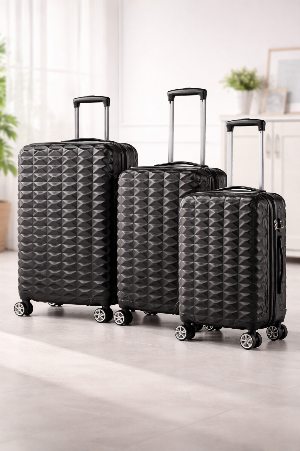 סט מזוודות טרולי קשיחות בעיצוב מודרני עם טקסטורת מעוינים יוקרתית, המשלב עמידות גבוהה עם נוחות תפעול מקסימלית. הסט כולל שלושה גדלים שימושיים – 20", 24", 28" – ומתאים לכל סוג נסיעה: חופשה משפחתית, טיסות קצרות, נסיעות עבודה וטיולים ארוכים.