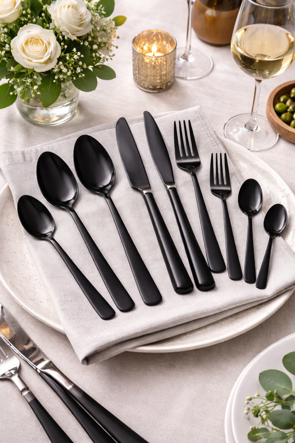 סט סכו״ם יוקרתי 24 חלקים בגימור שחור מבריק, המעניק לשולחן האוכל מראה מודרני, אלגנטי ומרשים. הסט כולל את כל הפריטים הדרושים לאירוח מלא – כפיות, כפות, מזלגות וסכינים – בעיצוב נקי וקלאסי שמשתלב בכל סגנון שולחן.