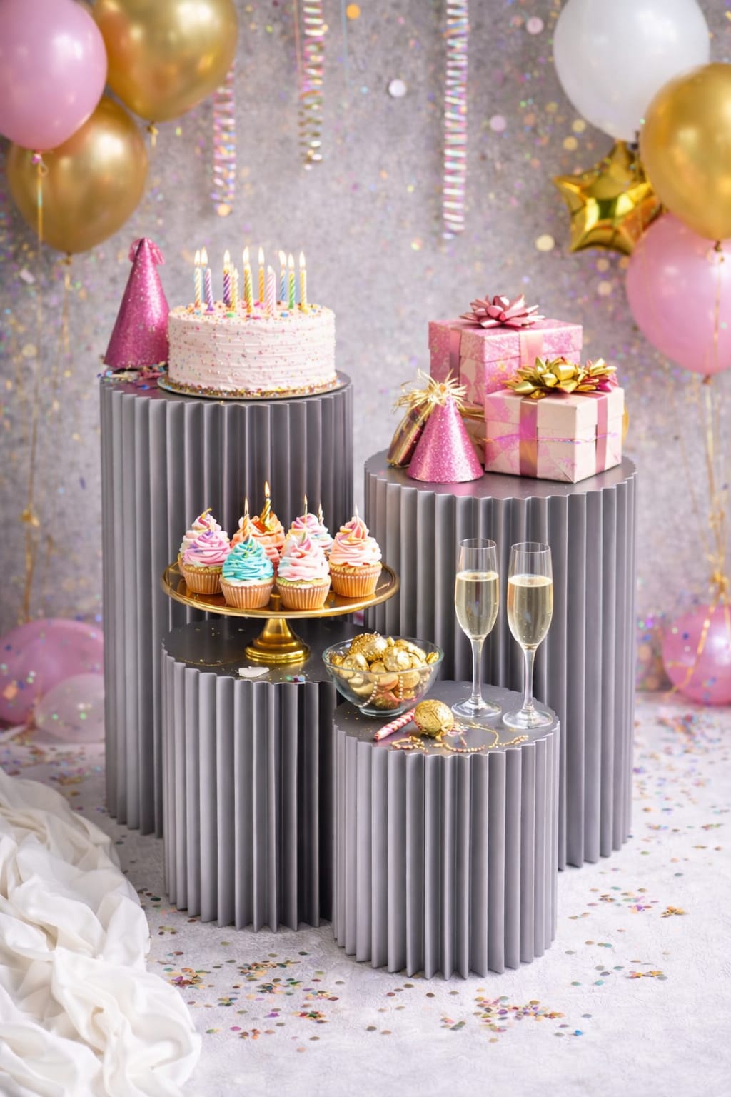 סט 4 שולחנות/במות תצוגה בעיצוב מודרני בצבע כסף – מושלם לאירועים, עיצוב שולחנות ותצוגת פריטים.