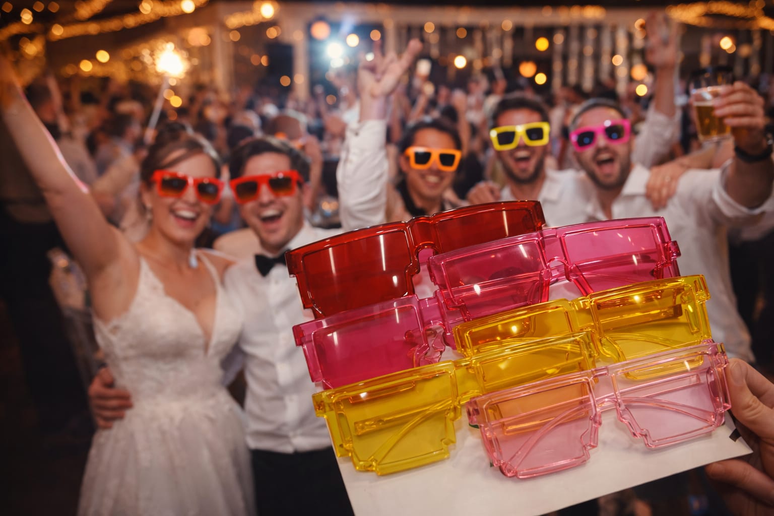 סט משקפי שמש צבעוניים ומדליקים, מושלמים לשדרוג האווירה בחתונות, מסיבות ואירועים שמחים.