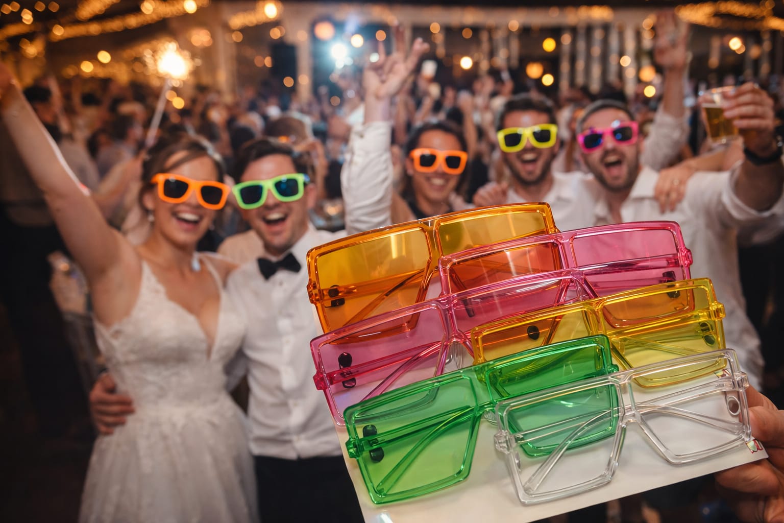סט משקפי שמש צבעוניים ומדליקים, מושלמים לשדרוג האווירה בחתונות, מסיבות ואירועים שמחים.