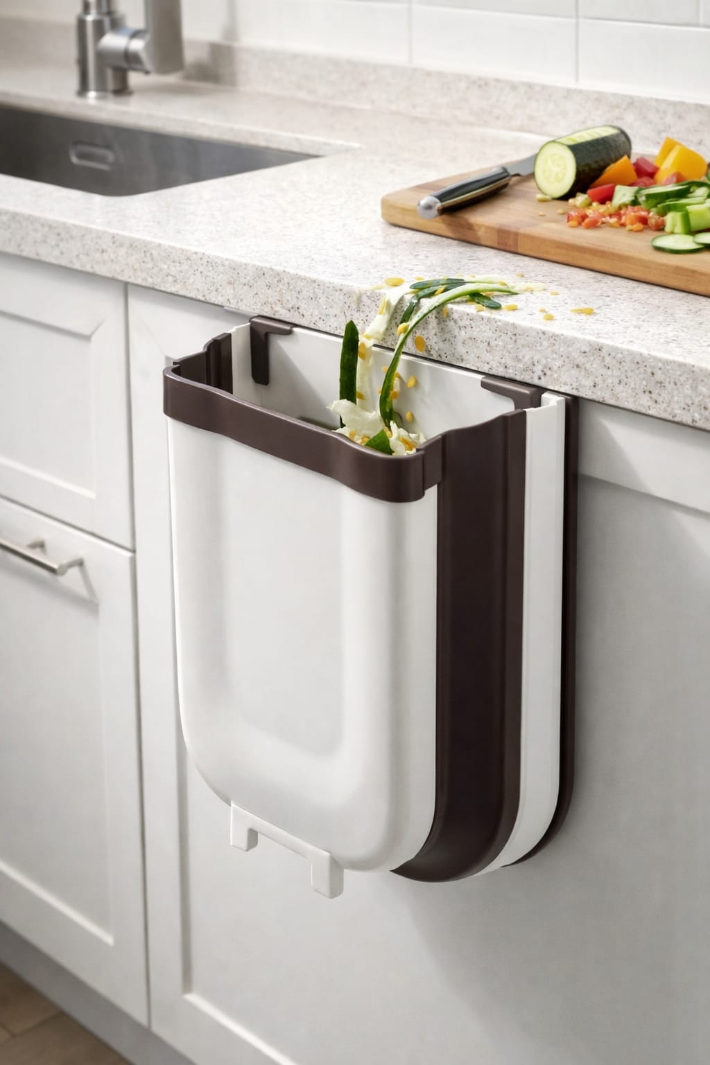 פח אשפה מתקפל לתלייה על ארון –פתרון מושלם ללכלוך ליד הכיור