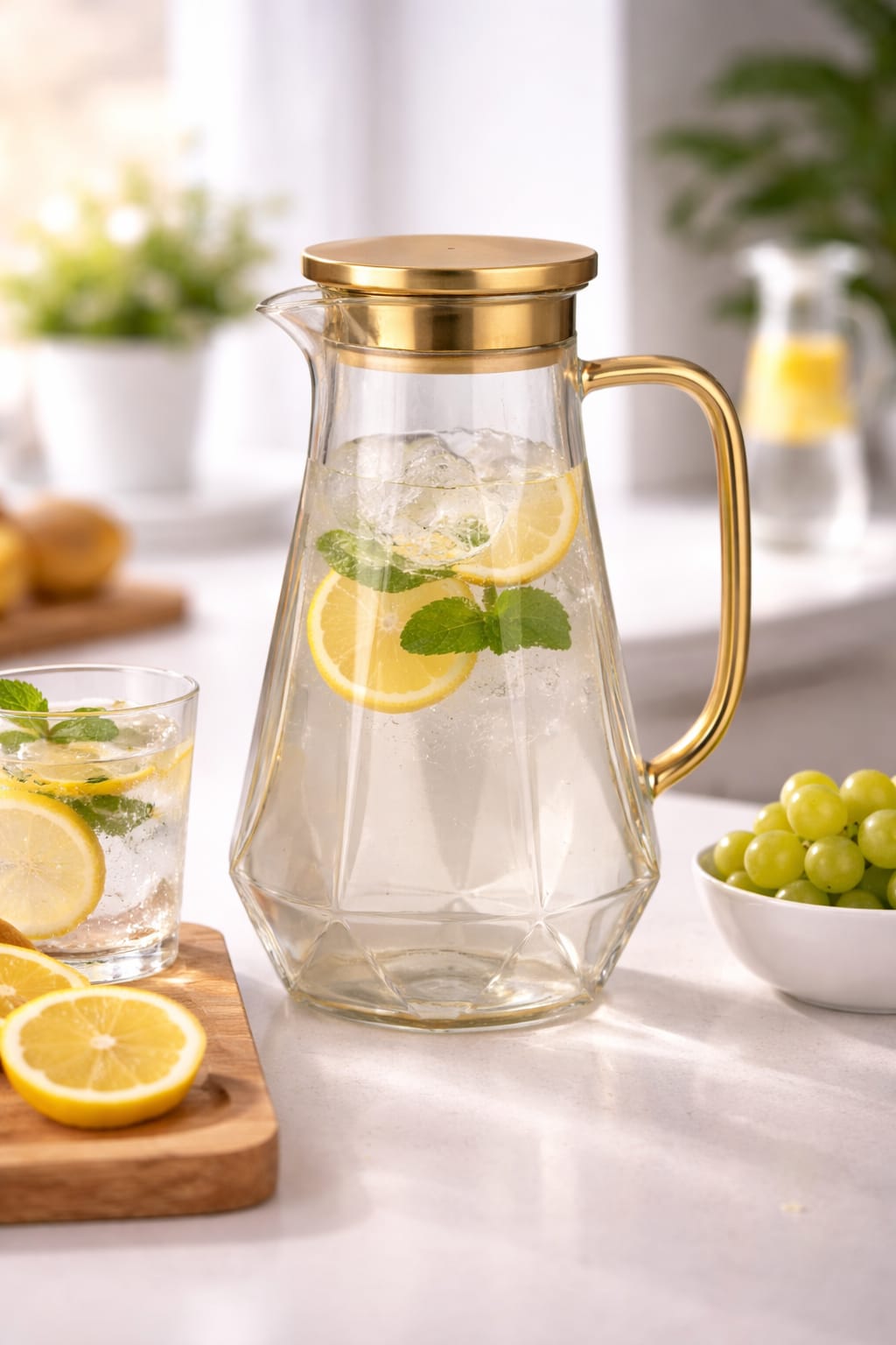 קנקן זכוכית מעוצב בנפח 1.8 ליטר עם ידית ומכסה בגימור זהב – שילוב מושלם של פרקטיות וסטייל יוקרתי לשולחן מרשים.