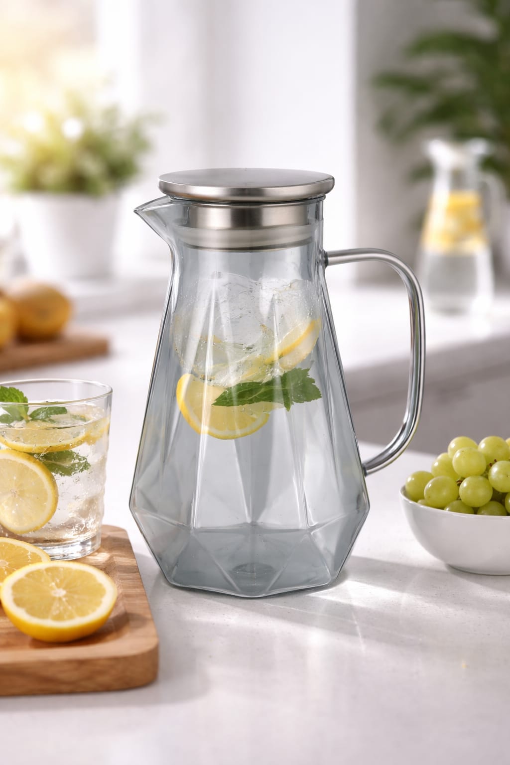 קנקן זכוכית מעוצב בנפח 1.5 ליטר עם מכסה נירוסטה איכותי – מושלם למים, מיצים ומשקאות קרים, לשולחן אלגנטי ביום-יום ובאירוח.