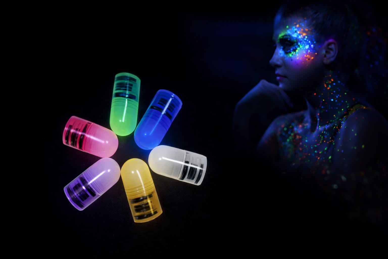 כל קפסולה מכילה חומר זוהר בצבע עז, הנראה במיוחד בתאורת UV / אור שחור, ומאפשר יצירת אפקטים מרהיבים על הפנים, הגוף והציפורניים.