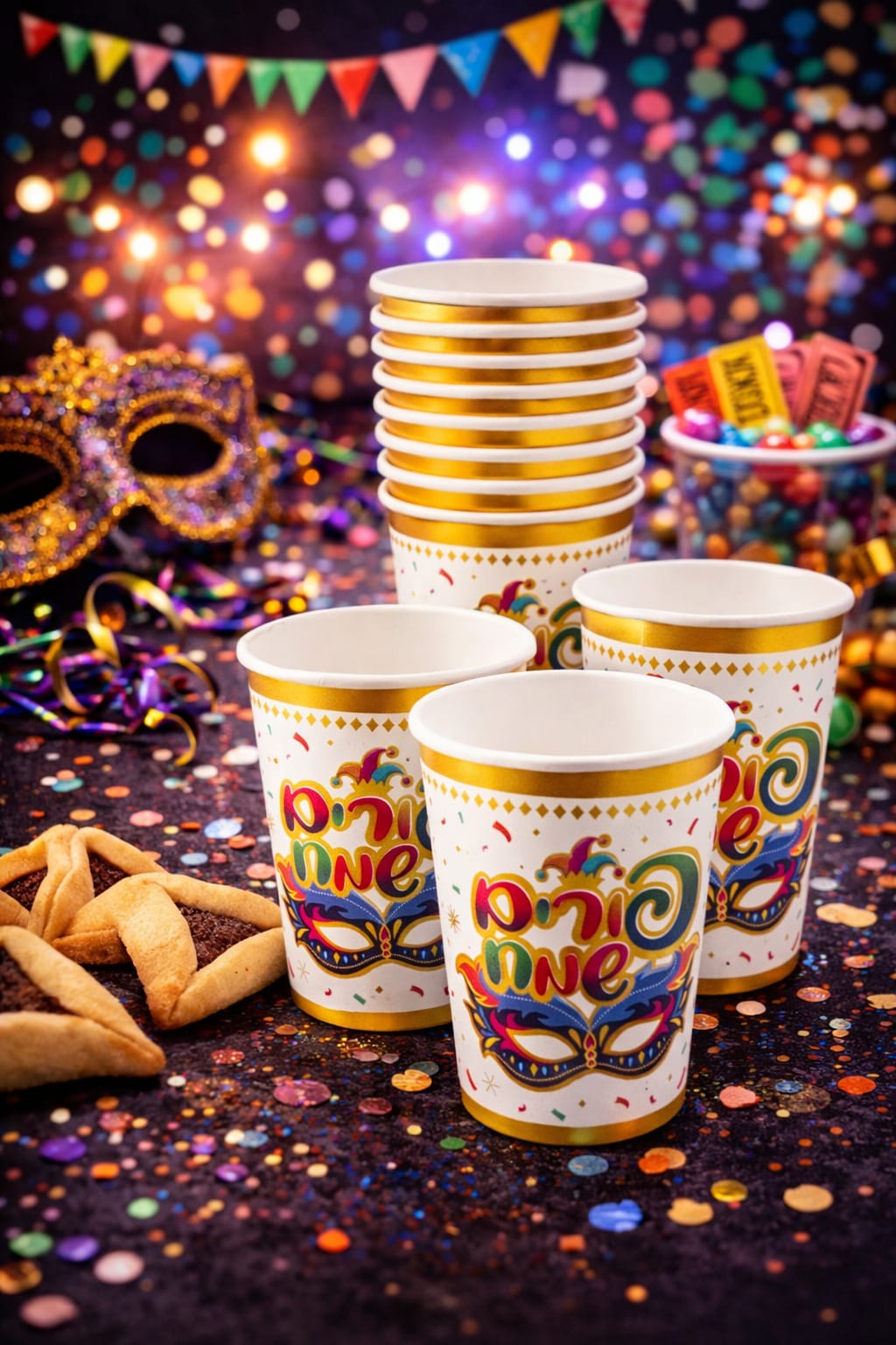 הכוסות עשויות נייר איכותי ועמיד, מתאימות לשתייה חמה או קרה, ונוחות לשימוש במסיבות פורים, משלוחי מנות, אירועי ילדים, ימי הולדת וחגיגות משפחתיות.